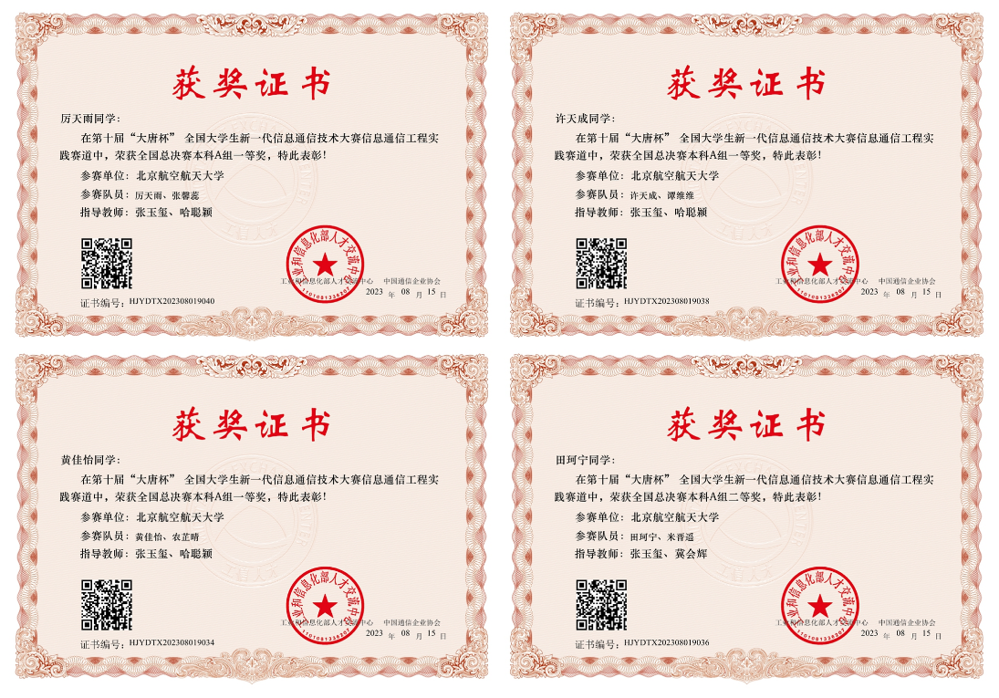 2023年7月14日至15日,第十届“大唐杯”全国大学生新一代信息通信技术大赛全国总决赛于beats365亚洲版官网举办。beats365亚洲版官网电子信息学院厉天雨、张馨蕊同学获本科A组全国总决赛一等奖第一名。