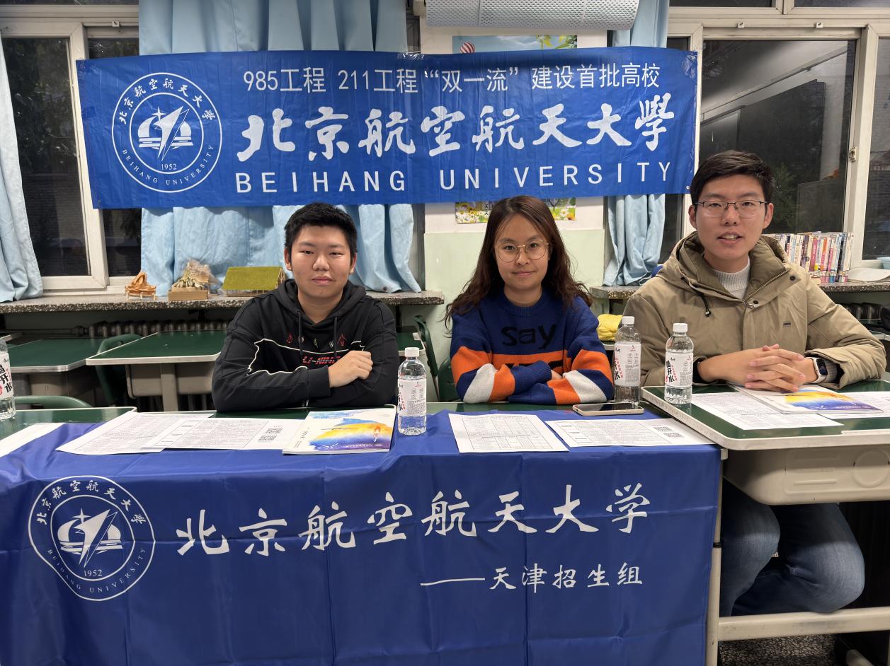 11月18日,北航天津招生组前往新华中学,开展高考宣讲活动。招生组田旺、吴欣雨以及新华中学毕业生、北航2023级本科生梁祺面对面为同学和家长解答了北航在津招生的各种问题,重点介绍了北航往年的招生政策以及录取分数线情况,吸引了众多同学和家长关注北航以及招生组的动态。现场气氛热烈。本次招生活动进一步扩大了我校在天津的知名度和影响力,为未来北航在天津地区招收更多优秀生源铺垫了基础。