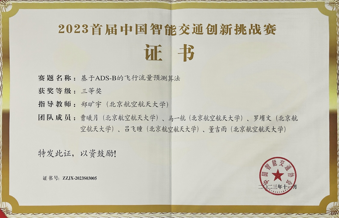 我院获得赛题三:基于ADS-B的飞行流量预测算法