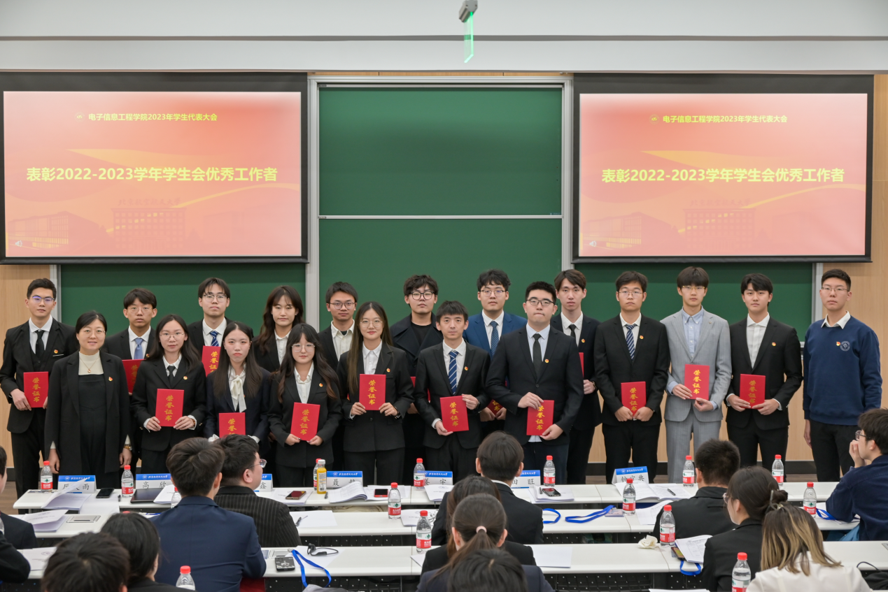 在紧张有序的计票时间中,大会表彰了2022-2023学年电子信息工程学院学生会优秀工作者。由2022级本科生辅导员刘耀鑫宣读名单,专职辅导员聂静老师、田旺老师为受表彰同学颁发证书。