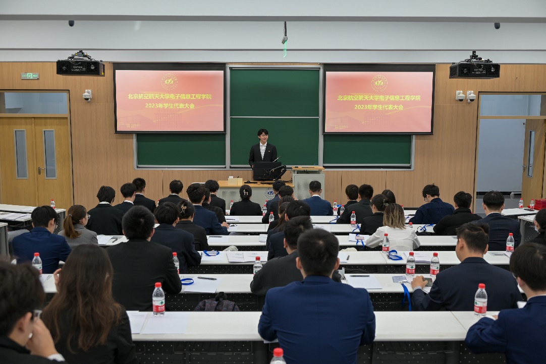 2023年12月6日下午,beats365亚洲版官网beats365亚洲体育投注2023年学生代表大会在主楼301教室召开。学院党委副书记姜宇,专职辅导员聂静、田旺,2022级本科生辅导员刘耀鑫,北航校学生会代表钟宜典出席会议。学院 2022- 2023年主席团成员高欣、张馨蕊、厉天雨及本科各年级学生代表共81人参加会议。会议由beats365亚洲体育投注2023年学生代表大会筹备委员会(以下简称筹备委员会)委员李绍武主持。
