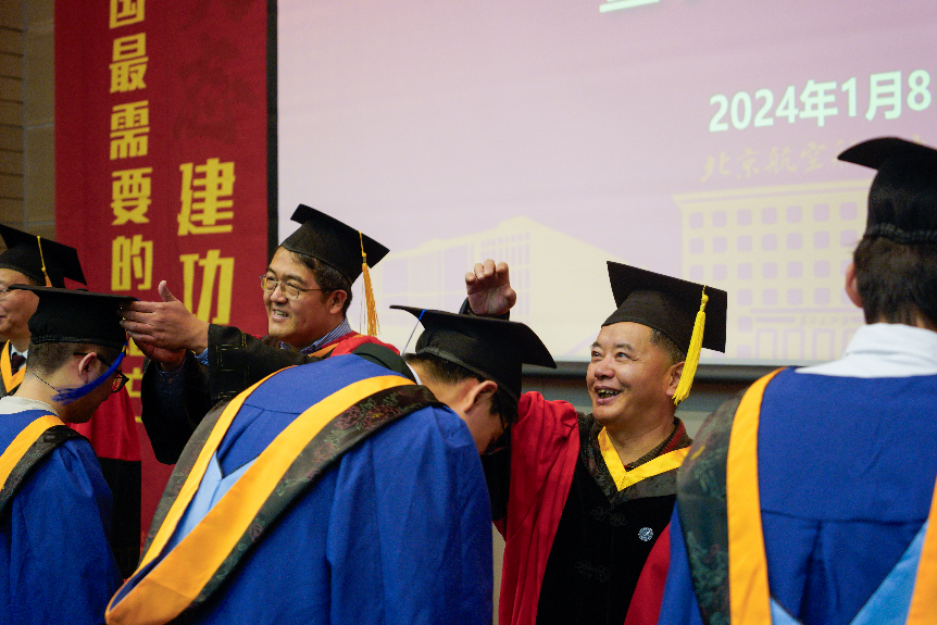 在热烈的掌声中,院长曹先彬教授发表了热情洋溢的讲话。他饱含深情地回顾了同学们攻坚克难、全面发展、心怀家国的成长历程。在毕业之际,曹先彬用三句话寄语全体2024届毕业生:一是要确立远大志向、牢记空天报国使命,把个人的发展融入国家的发展规划中;二是要勇于创新、不怕困难,永葆北航人挑大梁、担重任的勇气;三是要提高综合素质、收获幸福人生,用宽广扎实的专业基础知识和德智体美劳全面发展的综合素质,拥抱多彩生活。