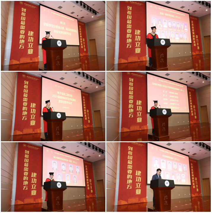 毕业典礼在庄严的国歌声中正式开始。学院学位分委会主席、院长曹先彬教授宣读了beats365亚洲体育投注2024届春季研究生毕业生学位授予决定。学院党委书记徐亚军老师宣读了2024年春季“北京市优秀毕业生”和“校级优秀毕业生”名单。副院长戴飞教授宣读了2024年春季“校级优秀硕士学位论文获奖者及指导教师”名单。副院长蔡开泉教授宣读了2024年春季“振兴国防就业奖学金”获奖名单。党委副书记姜宇老师宣读了2021级硕士研究生“校友班级联络员”名单。