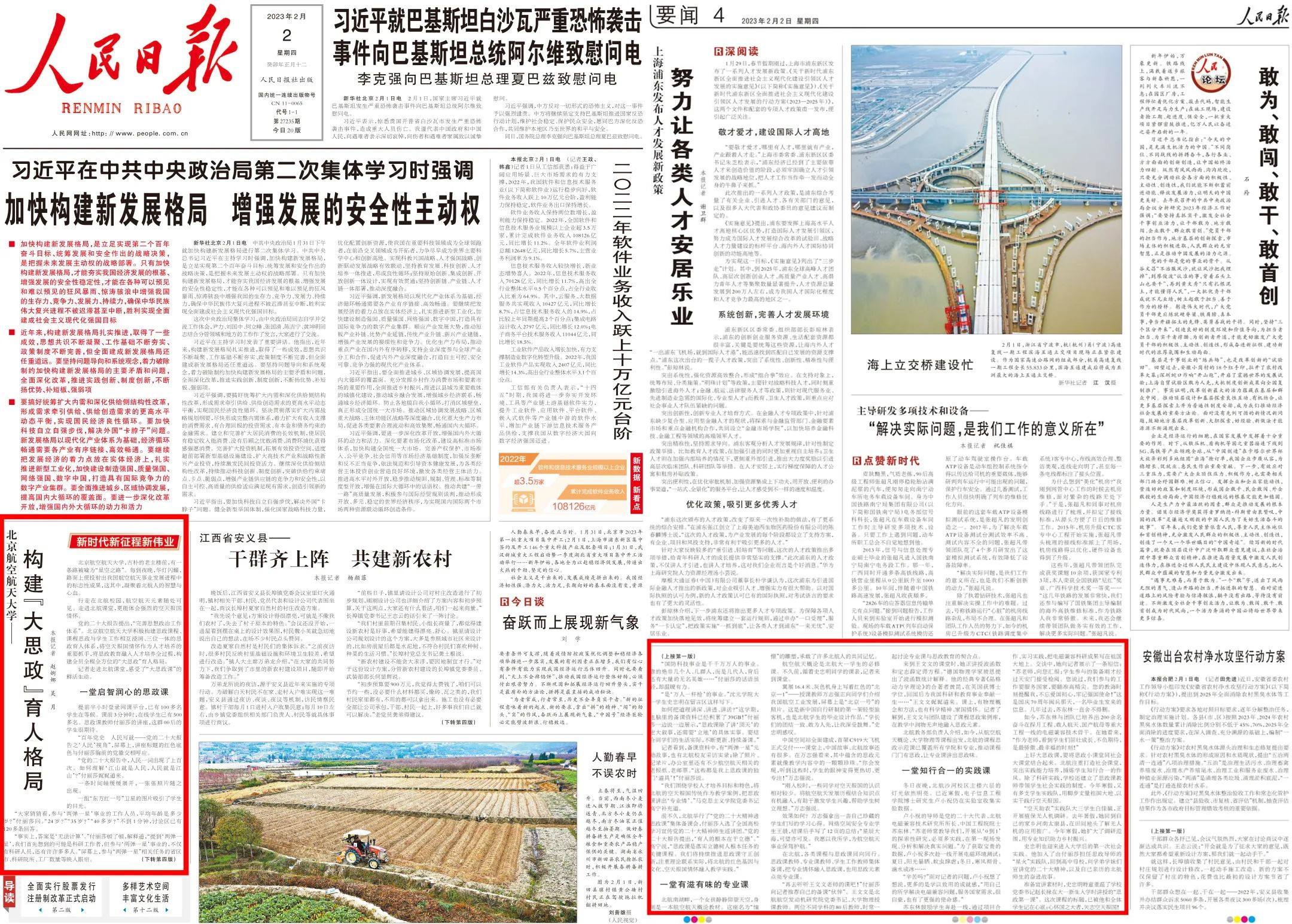 育才造士,为国之本。党的二十大作出关于“完善思想政治工作体系”的战略部署,习近平总书记就思想政治工作发表一系列重要论述,作出一系列重要指示批示,为我们开展工作提供了根本遵循。学校坚持将思想政治工作作为各项工作的生命线,传承弘扬以“空天报国”为内核的北航精神,统筹用好校内校外、线上线下、各行各业等育人资源,推进思政课程与课程思政、课上与课下、校内与校外、网上与网下育人资源的互融互动,以一流理念、一流师资、一流平台、一流服务、一流文化培养一流人才。