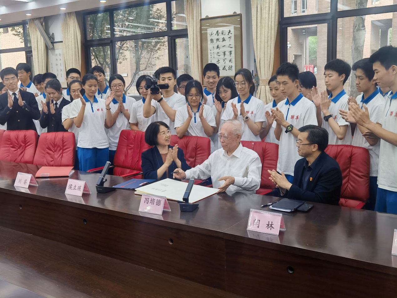 宣讲结束后,冯培德院士与耀华中学师生代表进行了交流座谈,共同回忆了在耀华中学读书的往事,并寄语青年学子要树立爱国精神、增强拼搏精神、培育创新精神、提倡团队精神。