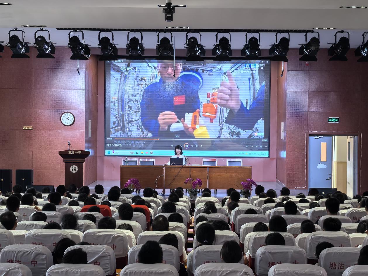 在学校大礼堂,北航“立德树人”卓越奖获得者、航空学院贾玉红教授为塘沽一中200余名高一高二优秀学生讲述航空航天科技前沿,培养塘沽学子对中国航空航天事业的热情和志向。