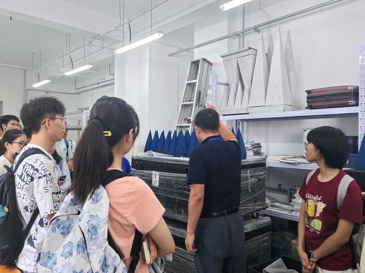 同学们在微波实验室观看飞机隐身特性测试,贴满吸波材料的暗室透出丝丝神秘。在老师的讲解下,同学们明白了这项研究对国防的重大意义。