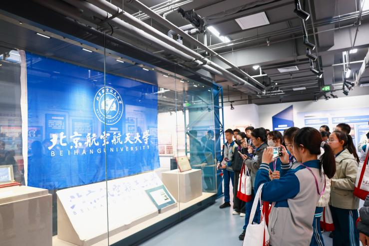 随后同学们跟随引导,来到校史馆进行参观。讲解员苏冠群同学从“空天报国”的主题雕像出发,到“创业兴学,与国同行”的历史,再到“立德树人,逐梦一流”的发展。讲解员向同学们讲述“北航大干一百昼夜送中国第一架轻型旅客机升空”的奋进故事,讲述“中阳县巨幅剪纸背后的北航故事”,“讲述那幅进入太空的北航校旗”……全面深刻感受北航人的空天报国志、空天奋斗史。最后,校友陈一诺同学、孙艺齐同学引导学弟学妹参观了北航校园。
