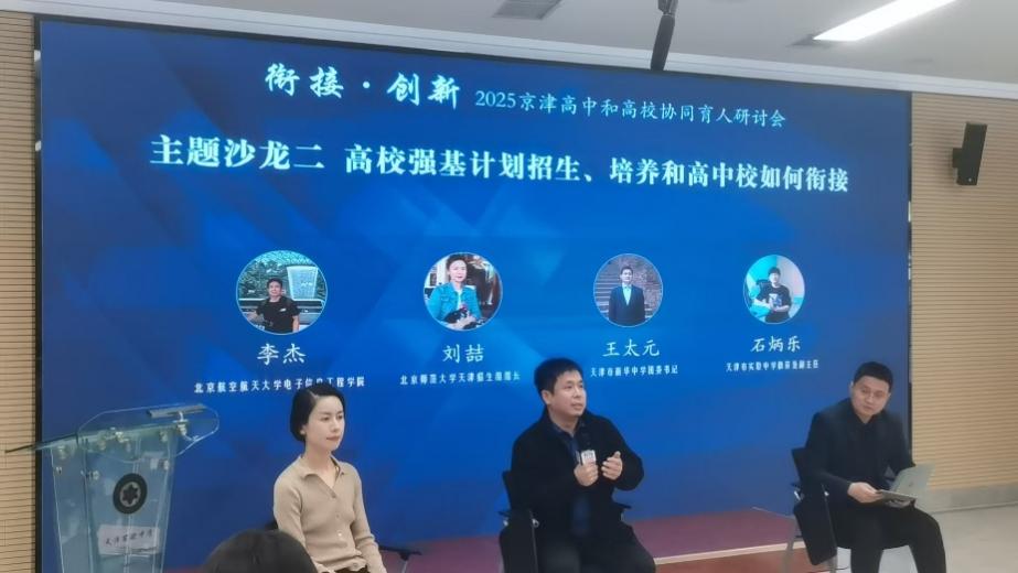 11月12日,招生组应邀参加京津高中和高校协同育人研讨会,专职辅导员李杰来到天津市实验中学,结合“高校强击计划招生、培养和高中校如何衔接”议题,面向“衔接··创新”主题进行交流讨论。