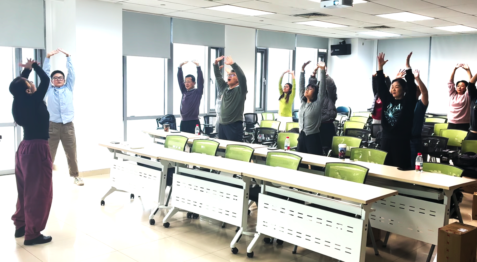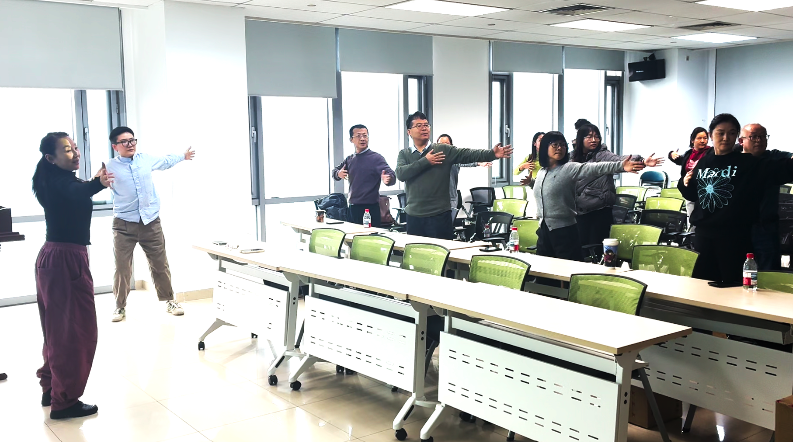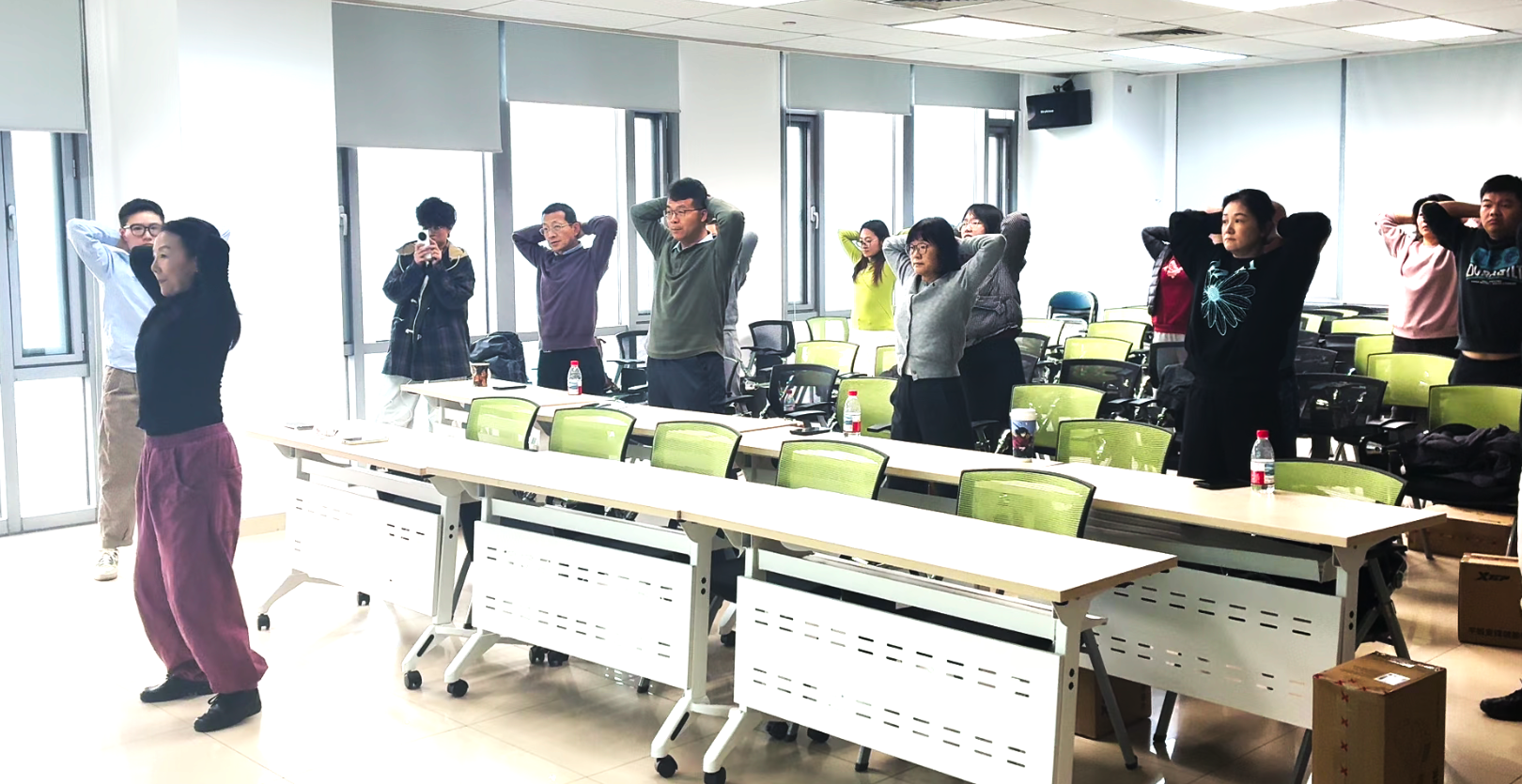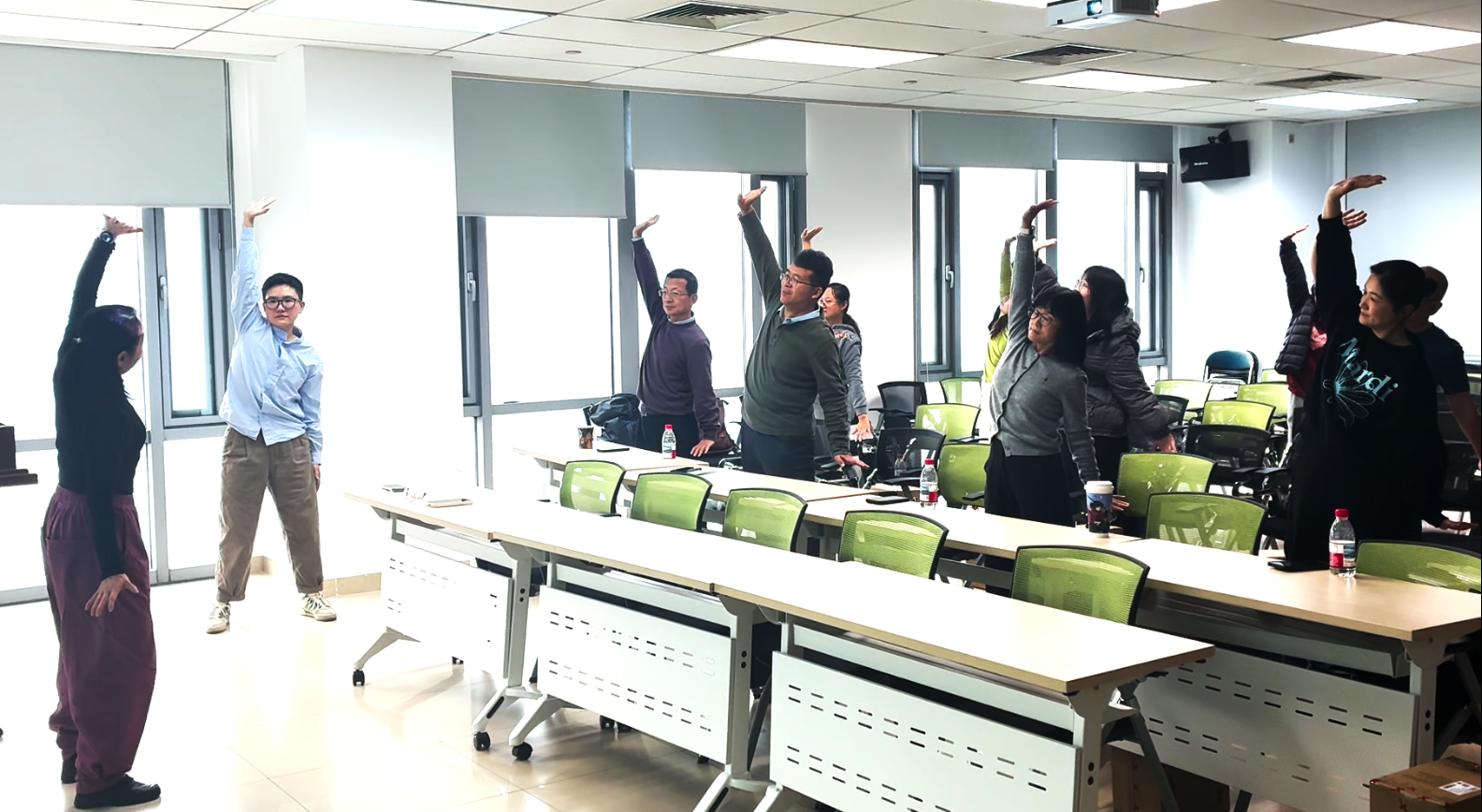 活动特邀国家体育总局运动营养课程特约讲师孙畅和王云鹏两位进行专题分享。孙畅讲师从医学角度出发,系统阐述了科学减重的原理与方法,详细讲解了饮食结构调整、营养素均衡搭配以及常见减重误区等内容,强调了“减重不等于减营养,减脂不等于减肌肉”的科学原则,为老师们提供了专业、安全的科学身材管理指导。随后,王云鹏讲师聚焦于日常健身,重点介绍了健腹轮的使用技巧、训练要点以及核心肌群锻炼的重要性,并在其带领下进入轻松愉悦的实践环节。大家跟随舒缓的音乐共同练习了传统养生功法“八段锦”,在动静结合中感受身心调和的舒畅,让大家亲身体验到了中国传统运动文化在调身、调息、调心方面的独特魅力,为整场活动画上了一个圆满的句号。