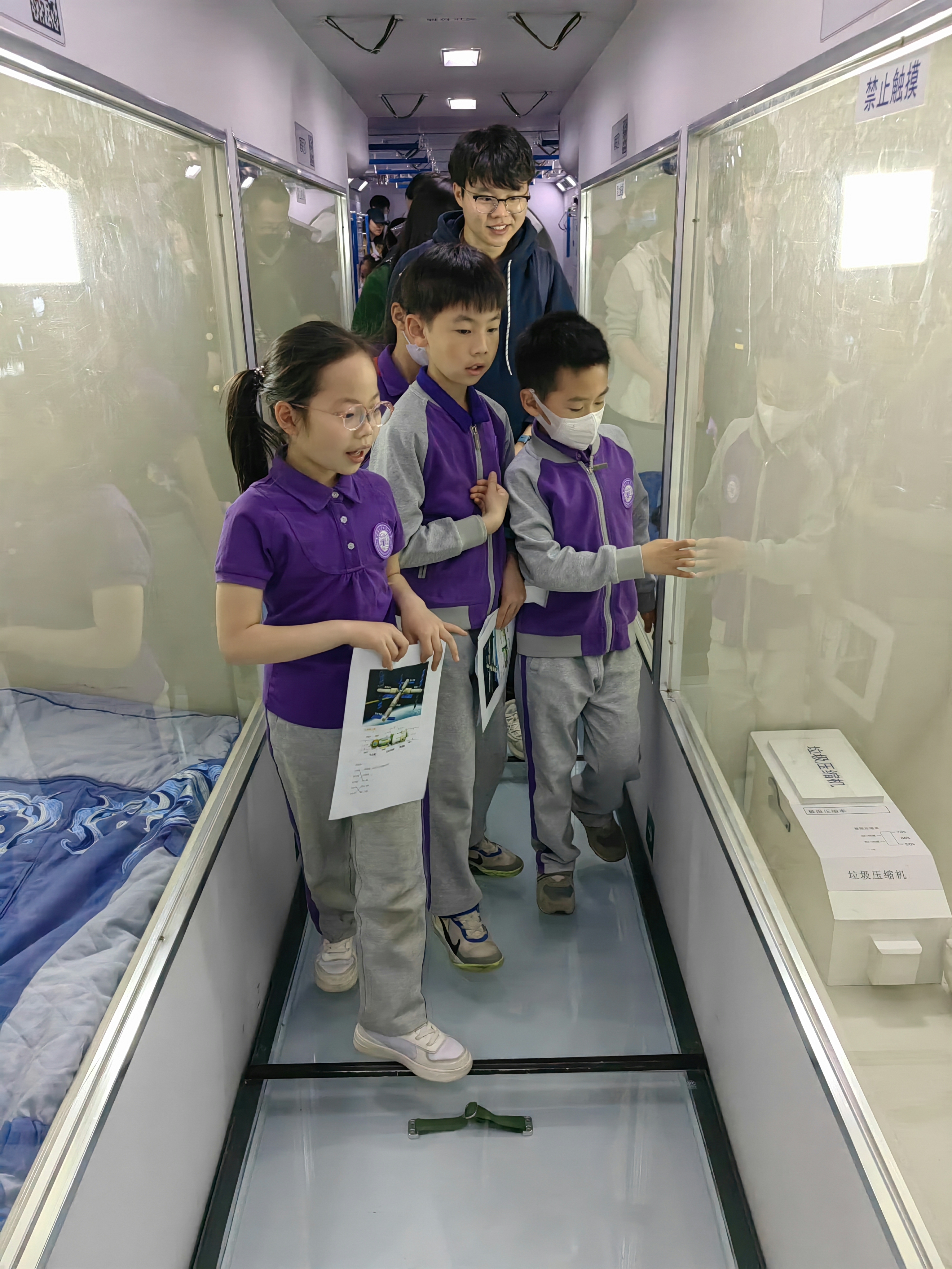 第三部分是参观天宫空间站天和核心舱的1:1模型。志愿者带领小学生们进入核心舱模型内部参观航天员生活和工作的环境。