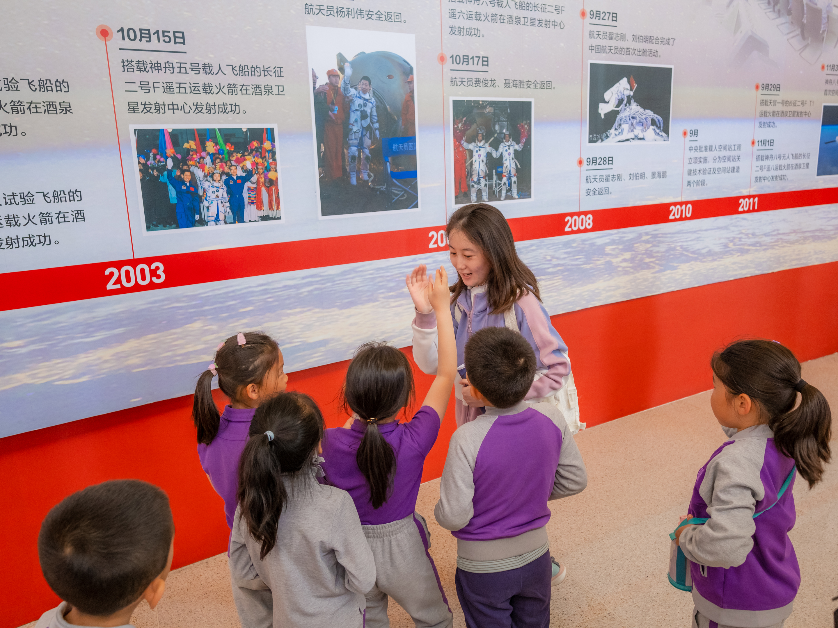 活动当天,志愿者带领小学生们依次参观了展览的三个部分:一是中国载人航天工程30 年的成就回顾,二是载人航天工程所用的一些航天器的模型,最后是天宫空间站天和核心舱的1:1模型。