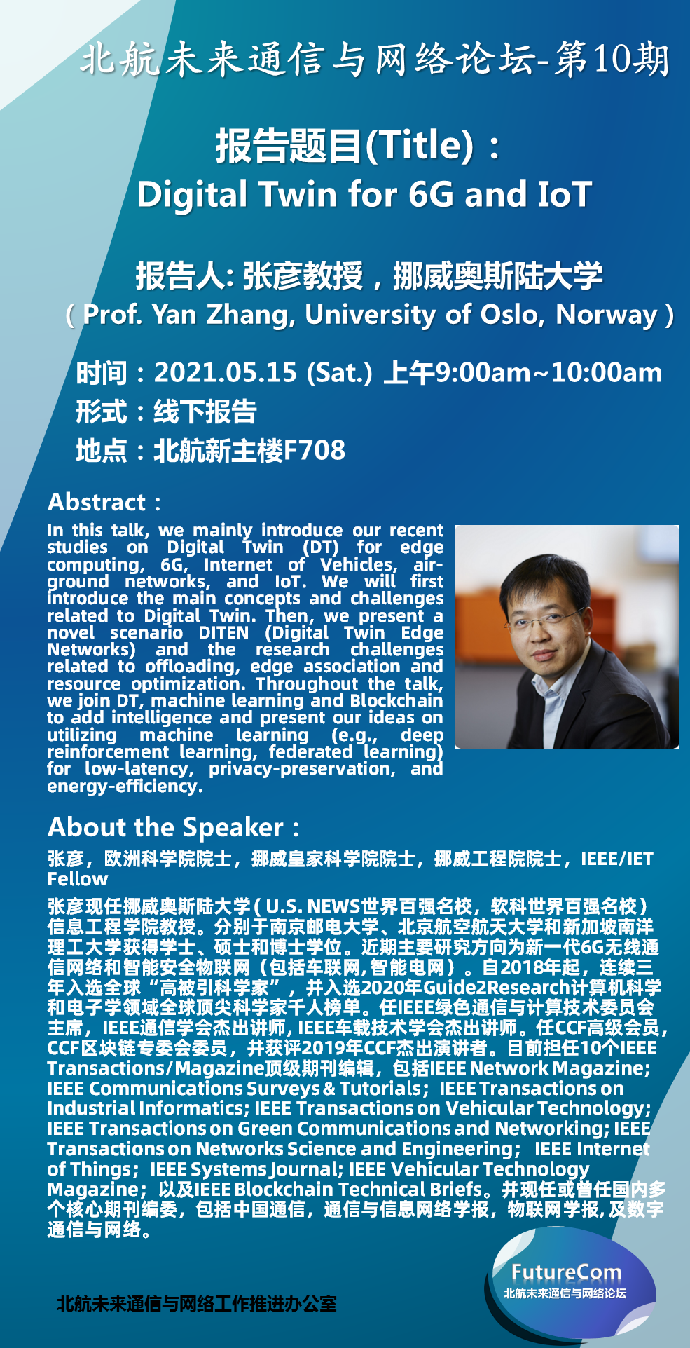 张彦现任挪威奥斯陆大学 ( U.S. NEWS世界百强名校,软科世界百强名校)信息工程学院教授。分别于南京邮电大学、beats365亚洲版官网和新加坡南洋理工大学获得学士、硕士和博士学位。近期主要研究方向为新一代6G无线通信网络和智能安全物联网(包括车联网, 智能电网)。自2018年起,连续三年入选全球“高被引科学家”,并入选2020年Guide2Research计算机科学和电子学领域全球顶尖科学家千人榜单。任IEEE绿色通信与计算技术委员会主席,IEEE通信学会杰出讲师, IEEE车载技术学会杰出讲师。任CCF高级会员,CCF区块链专委会委员,并获评2019年CCF杰出演讲者。目前担任10个IEEE Transactions/Magazine顶级期刊编辑,包括IEEE Network Magazine; IEEE Communications Surveys & Tutorials;IEEE Transactions on Industrial Informatics; IEEE Transactions on Vehicular Technology; IEEE Transactions on Green Communications and Networking; IEEE Transactions on Networks Science and Engineering; IEEE Internet of Things;IEEE Systems Journal; IEEE Vehicular Technology Magazine;以及IEEE Blockchain Technical Briefs。并现任或曾任国内多个核心期刊编委,包括中国通信,通信与信息网络学报,物联网学报, 及数字通信与网络。